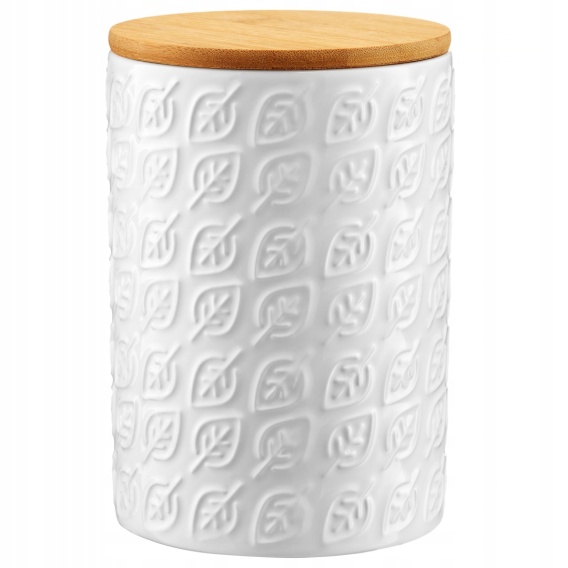 Pojemnik ceramiczny Tuvo listki 1110 ml to doskonały sposób na wygodne i estetyczne przechowywanie sypkich produktów. Posiada bambusową pokrywkę, która zapewnia szczelność oraz bezpieczne przechowywanie produktów, np. makaronu, ryżu lub mąki. Bardzo ładnie prezentuje się również na blatach nowoczesnych kuchni. Spełnia także funkcję dekoracyjną.