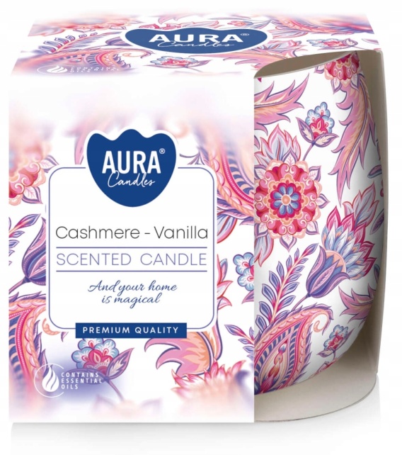 Świeca zapachowa w szkle, ozdobiona folią z motywem kaszmiru i wanilii oraz czasem palenia do 20 godzin BISPOL.