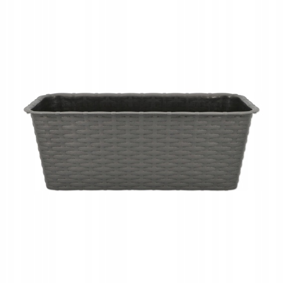 ✅ Prostokątny pojemnik do sadzenia roślin balkonowych, który wygląda jak wyplatany z włókien rattanowych.