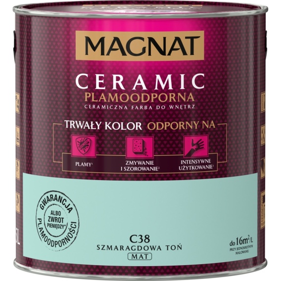 MAGNAT Ceramic to ceramiczna farba do wnętrz, 3. generacji bazująca na ceramicznych komponentach oraz najwyższej jakości żywicach i pigmentach. Ta unikalna formuła zapewnia farbie MAGNAT ponadprzeciętne parametry odporności na szorowanie i wielokrotne zmywanie oraz sprawia, że powłoki farby nie absorbują zabrudzeń i „trudnych" plam oraz są odporne na dezynfektanty. Zapewnia to uzyskanie wyjątkowej trwałości powłoki i kolorów.