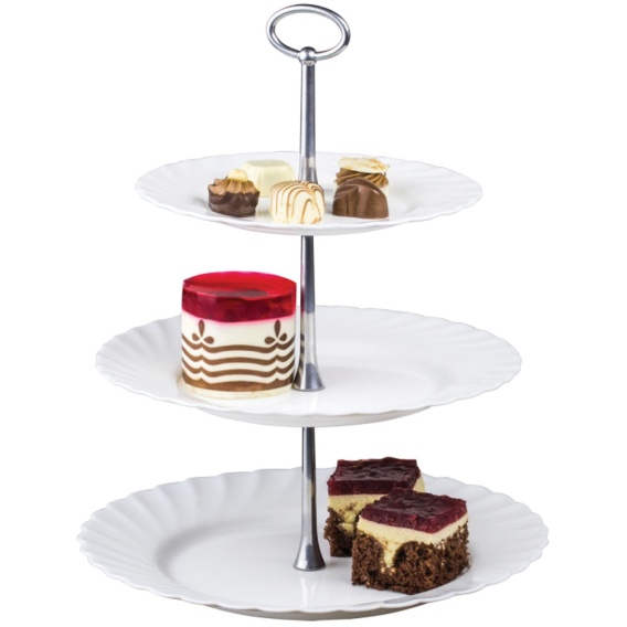 Patera trzy-poziomowa z serii Trianon marki Luminarc. Wykonana jest ze szkła hartowanego. Posiada bardzo wysoką odporność na zadrapania oraz uderzenia. Gładka, nieporowata powierzchnia umożliwia proste i dokładne mycie. Patera to świetny sposób na efektowne podanie ciast, ciasteczek oraz owoców. Doskonale sprawdzi się podczas spotkań w gronie najbliższych i będzie świetnie prezentować się na stole.