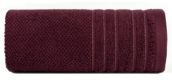 Klasyczny ręcznik kąpielowy z chłonnej tkaniny bawełnianej o splocie frotte. Minimalistyczna bordiura z weluru z dodatkiem lśniącej, metalicznej nici. szerokość: 70 cm, długość: 140 cm, kolor: bordowy, Gramatura: 500 GSM, Skład: 100% bawełna: 80% nić metaliczna 20% bawełna