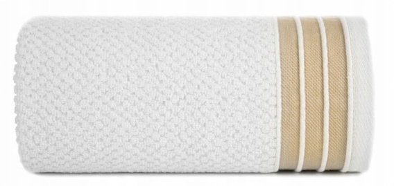 Jednobarwny ręcznik z miękkiej i chłonnej tkaniny bawełnianej o splocie frotte zdobiony kolorową bordiurą w stylu fastrygi. Łatwy w praniu, nie farbuje. Gramatura: 500 GSM, Skład: 100% bawełna; część ozdobna: 80% poliester, 20% bawełna