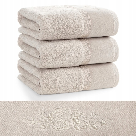 Piękny ręcznik kąpielowy z miękkiej i chłonnej bawełny frotte zdobiony na bordiurze aplikacją w formie serduszek wypełnionych różyczkami. Doskonały na prezent.