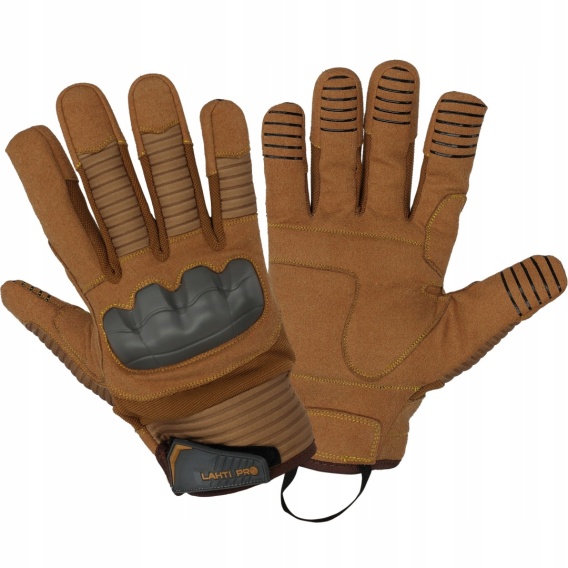 Rękawice taktyczne Lahti Pro model L2814 wzorowane są na rękawicach amerykańskich oddziałów specjalnych. Idealnie sprawdzają się w trudnych warunkach bojowych i sportach motocyklowych. Rękawice wykonano ze skóry syntetycznej, specjalne wzmocnienie doskonale chroni knykcie i paliczki przed urazami i stłuczeniami. Wzmocnienia na części chwytnej rękawicy chronią przed przetarciami i urazami, miękka poduszka na części chwytnej chroni przed odciskami i wibracjami. Silikonowy wzór na końcówkach palców podnosi komfort pracy z przedmiotami śliskimi a dodatkowo zastosowane wzmocnienie na palcu wskazującym rękawicy chroni przed jej przetarciem. Elastyczny ściągacz z zaczepem na rzep zapewnia komfort i zapewnia dobre trzymanie rękawicy na dłoni.