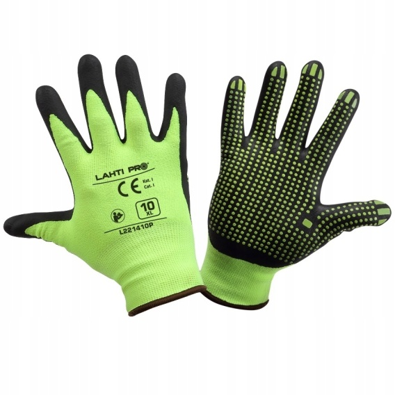 Rękawice Lahti Pro L2214 w kolorze żółto-czarnym wykonane z nylonu, elastanu oraz nitrylu. Rękawice powlekane nitrylem o porowatej strukturze zwiększającym odporność na przetarcia i rozdarcia oraz podwyższającym przyczepność. Wierzchnia część rękawicy wykonana z materiału o podwyższonej widoczności. Powłoka w postaci spienionego nitrylu zapewnia wysoką oddychalność. Elastyczne i rozciągliwe idealnie dopasowują się do kształtu dłoni. Zakończone ściągaczem. Szeroki zakres zastosowań, zalecane do delikatnych prac w suchych warunkach, prace precyzyjne, drobne montaże, np.: montaż mebli lub praca przy instalacjach elektrycznych, ogrodnictwo, prace magazynowe, budownictwo. Posiadają deklarację CE oraz zgodne są z normą EN 420. Pierwsza kategoria środków ochrony indywidualnej.
