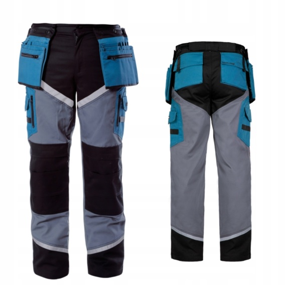 Spodnie robocze do pasa wykonano z materiału o gramaturze 270g/m2 (35% bawełny, 65% poliester) w kolorze czarno-szaro-turkusowym z pasami odblaskowymi poprawiającymi widoczność pracownika podczas pracy.
