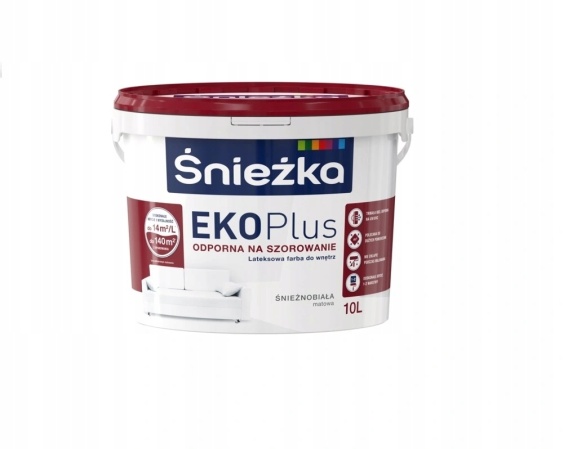 ŚNIEŻKA EKO PLUS - to produkt, który charakteryzuje się snieżnobiałym kolorem o wysokim poziomie matowości. Tworzy powłokę trwałej bieli odpornej na szorowanie oraz działanie UV/UVC. ŚNIEŻKA EKO Plus dzięki właściwościom aplikacyjnym, doskonałej przyczepności do podłoża oraz nie chlapaniu podczas malowania polecana jest do malowania większych powierzchni.