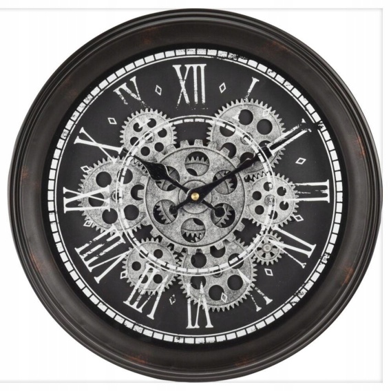 Zegar ścienny o średnicy 35 cm. Posiada mechanizm obrotowy kół zębatych. Zegar jest modnym dodatkiem oraz ozdobą każdego mieszkania. Idealny pomysł na prezent. Wyprodukowano zgodnie z europejskimi standardami.